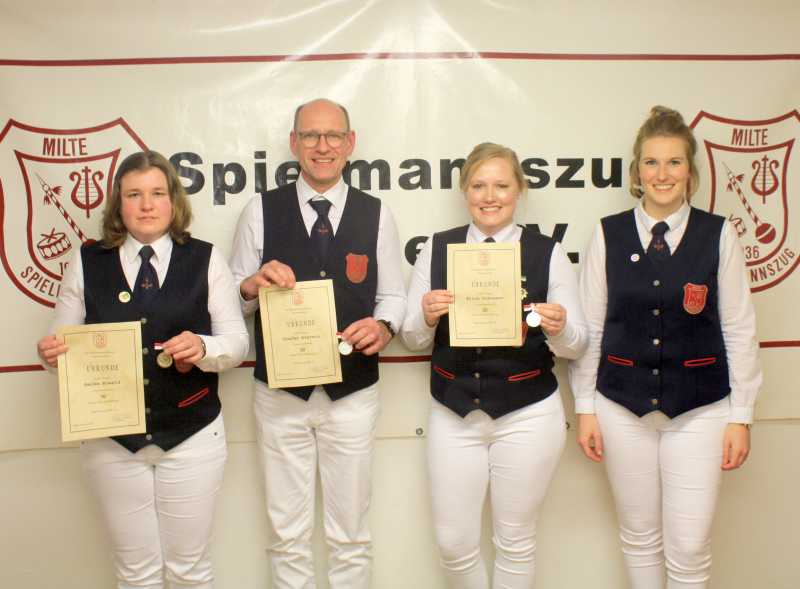 Im Vorfeld hatte Schriftführerin Christina Evermann das vergangene Jahr mit einem bebilderten Rückblick Revue passieren lassen. Stark setzt sich der Verein auch für seine jungen Nachwuchstalente ein, wie am gemeinsamen Jugendausflug, einem Jugendkonzert oder Spieleabenden deutlich wurde. Stolze 21 Auftritte hatte der Spielmannszug im letzten Jahr absolviert, dem zurzeit 68 aktive Musiker angehören. „Im Vergleich zählen wir damit zu den mitgliedstärksten Spielmannszügen des Kreises“, zeigte sich auch die 1. Vorsitzende Christine zur Wickern erfreut, die souverän durch den Abend führte. Von einem leichten Defizit berichtete Eva Abeck in ihrem Kassenbericht. Eine stärkere Bewerbung des vom Spielmannszug traditionell veranstalteten Tanz in den Mai, soll dem Minus zukünftig vorbeugen. Neben dem eigenen Schützenfest stehen mit dem Kreisehrengardentreffen und dem Sattelfest in diesem Jahr zwei weitere Heimspiele in Milte an. Zusätzlich wird sich der Spielmannszug neben den altbekannten Terminen auch am Ehrengardenjubiläum in Freckenhorst, sowie den Vereinsjubiläen der Spielmannszüge in Harsewinkel und Greffen beteiligen. Auch die Vorbereitungen für das eigene 90jährige Jubiläum, dass der 1936 gegründete Spielmannszug Milte im nächsten Jahr begehen kann, laufen bereits.