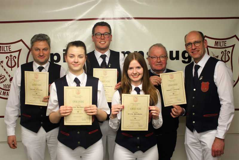 Ehrungen für 10-jährige Mitgliedschaft erhielten Michelle Hagemeyer und Alina Waldmann. Tambourmajor Matthias Danwerth gehört dem Verein seit 20 Jahren an. Für 40 Jahre wurden Rainer Kuhlage und für außergewöhnliche 55 Jahre Hubert Lienkamp geehrt. Sonderpräsente erhielten Jana Baune, die an allen 35 Übungsabenden anwesend war; Christine Danwerth und Anne Ketteler hatten an 19 Auftritten teilgenommen. Für seine Vorstandsarbeit wurde Ulf Borgmann geehrt. Außerdem erhielt Nikolas Seibring ein Präsent für seinen uneigennützigen Einsatz bei der Innenausstattung und dem Bau des Instrumenten-Anhängers.