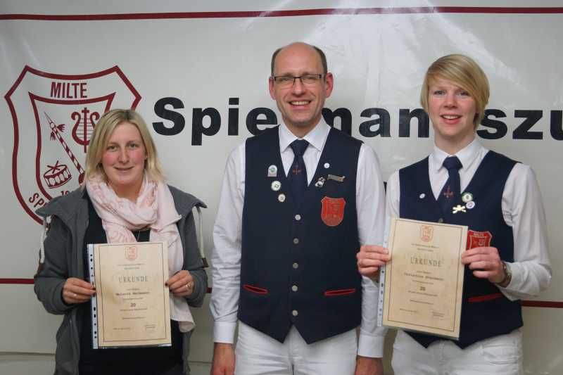 Zur Bewältigung der anstehenden Aufgaben setzten die 41 anwesenden Spielleute weiter auf das bewährte Team des Vorstandes. So wurden die 2. Vorsitzende Christine Danwerth, Kassiererin Kerstin Grosse Brockmann, Jugendvertreterin Alina Waldmann und Beisitzer Ulf Borgmann durch Wiederwahl in ihren Ämtern bestätigt. Zur neuen Kassenprüferin wählte die Versammlung Melanie Meckmann. Zusammen mit Christina Evermann erhielt dieselbe auch eine Urkunde für ihre 20jährige Mitgliedschaft. Ein großes Lob und Gutscheine erhielten Marie Pries, Verena Volmer und Carolin Abeck, welche bereits den D3-Lehrgang des Volksmusikerbundes absolviert hatten. Präsente erhielten auch Eva Holtkamp, die an allen Übungsabenden dabei gewesen war, sowie Michelle Hagemeyer, die alle 22 Auftritte des vergangenen Jahres mitgemacht hatte. Dass der Zusammenhalt und der Spaß an der Geselligkeit unter den Mitgliedern groß geschrieben wird, zeigt unter anderem die geplante Vereinsfahrt zum Heidepark Soltau in 2017.
